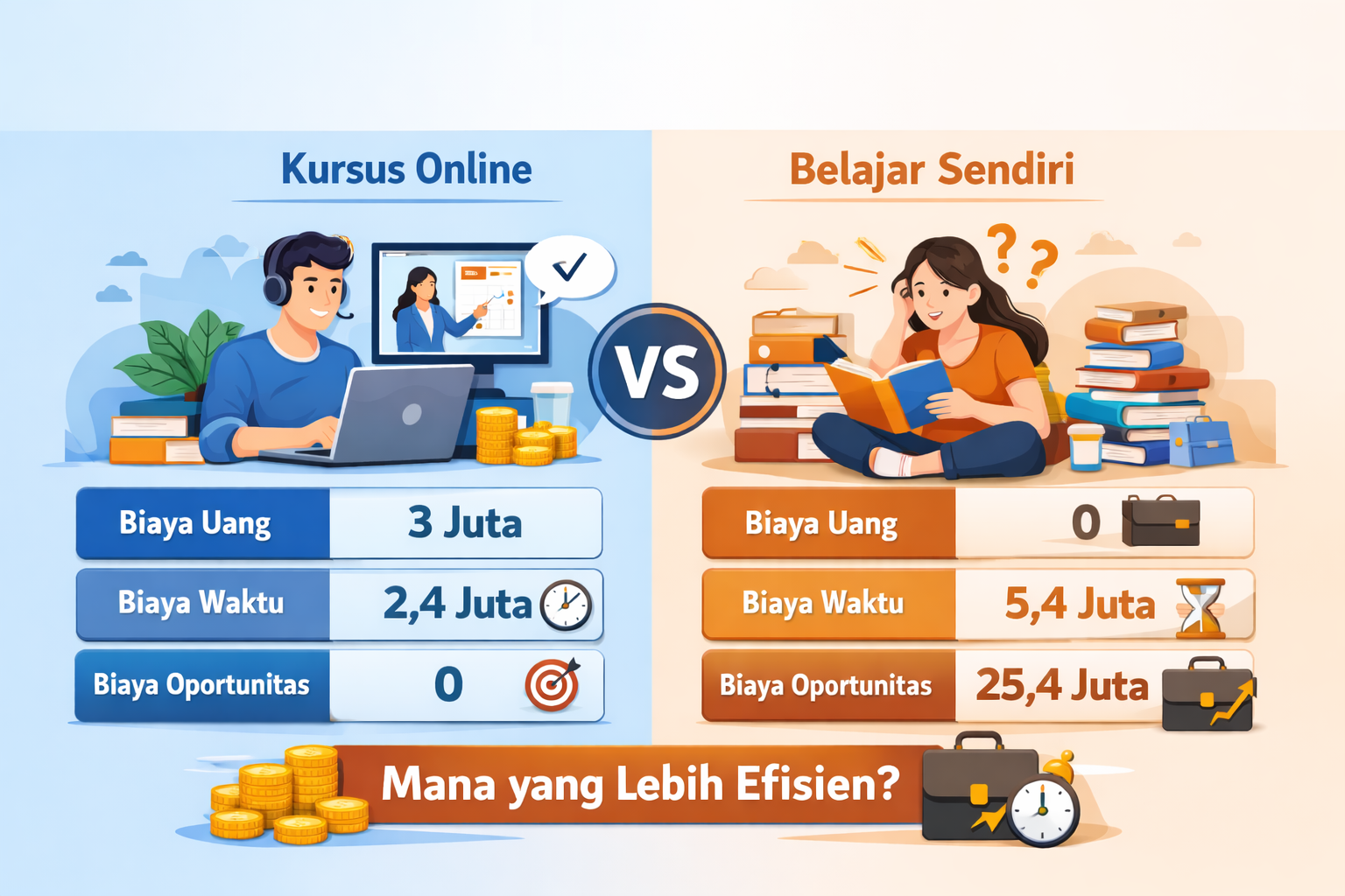 Dari simulasi perhitungan tersebut, Teman Belajar bisa melihat bahwa ikut bootcamp ataupun kursus tidaklah selalu “semahal” yang dibayangkan. Adanya biaya waktu dan biaya oportunitas yang justru sering terabaikan membuat perbedaan dampak keduanya menjadi tersembunyi. Jadi, “gratis” vs “berbayar” itu bukan hanya perkara finansial yang tampak, ya!