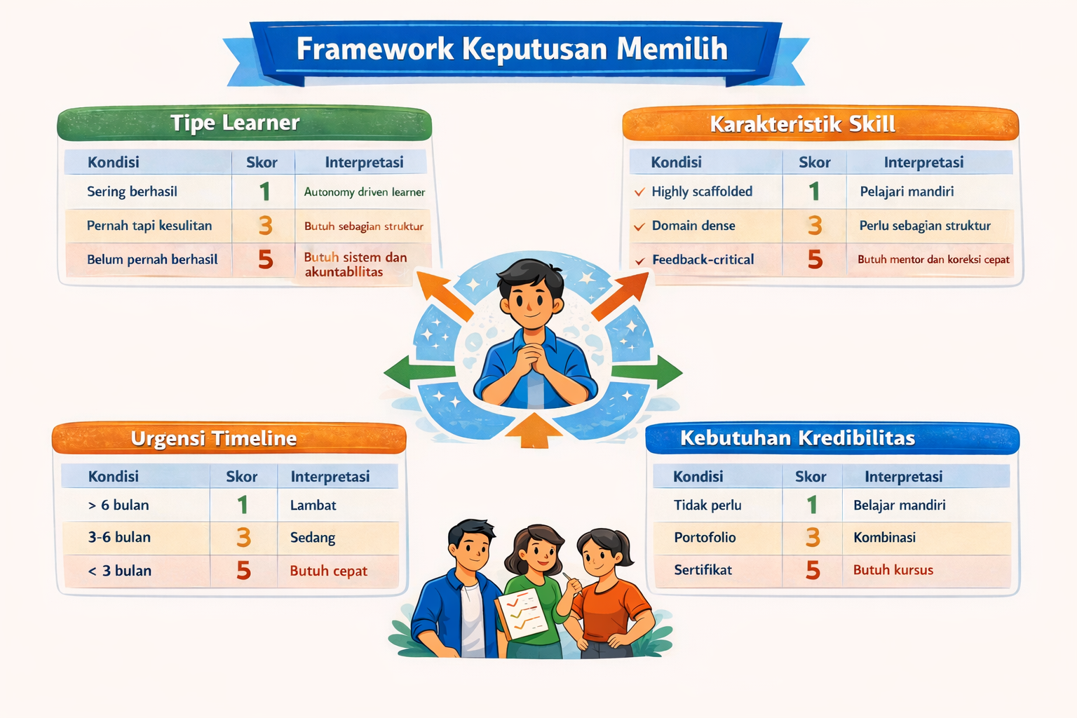 Setelah memahami apa saja tipe learner, tipe skill, dan timeline, Teman Belajar sekarang punya cara sistematis untuk menggabungkan semuanya menjadi sebuah keputusan yang rasional. Coba jawab empat pertanyaan berikut ini dengan jujur: