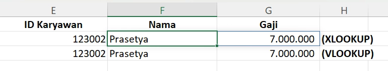 Dengan rumus VLOOKUP, Teman Belajar perlu melakukan pencarian satu per satu untuk mengetahui “Nama” dan “Gaji” karyawan: