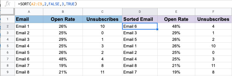 =SORT(range, sort_column, is_ascending)